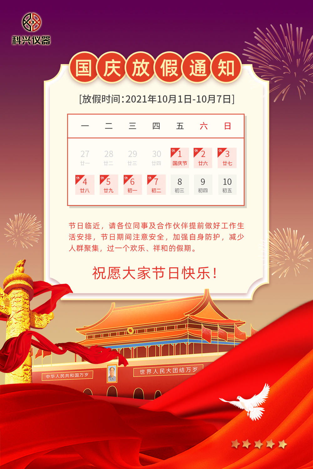 您好!感謝大家一直以來對上??婆d儀器的信任和支持,在國慶節來臨之際,我司決定于10月1日至10月7日放假7天,10月8日起恢復正常工作,給您帶來的不便敬請諒解,謝謝合作!在此祝您國慶節快樂!